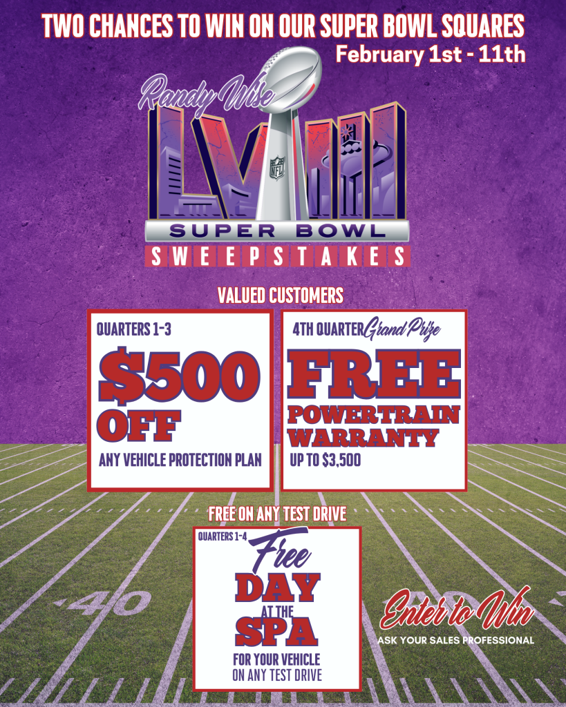 Exciting news from Randy Wise Buick GMC! This February, don’t miss out on our Super Bowl Sweepstakes Extravaganza! Get ready for an exhilarating ride through each quarter of the Super Bowl! We’ll pick a winner at the end of the first, second, third, and fourth quarter and post the winners on February 12th on our Facebook Page!