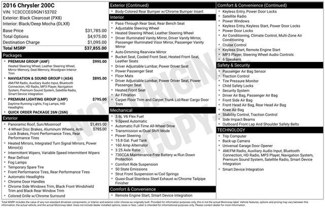 For sale: 2016 Chrysler 200 C AWD 4D Sedan in Black Clearcoat with Black/Deep Mocha Premium Leather Interior. This is the top-trim 200 C equipped with the powerful 3.6L V6 24V VVT engine and 9-speed automatic transmission.