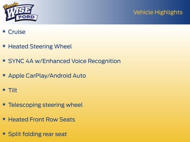- Navigation system: Connected Navigation, SiriusXM Radio w/360L, Automatic temperature control, Rear window defroster, Power driver seat, Power windows, Remote keyless entry, Steering wheel mounted audio controls, Speed-sensing steering, Traction control, ABS brakes, Electronic Stability Control, Exterior Parking Camera Rear, Security system, Cruise, Apple CarPlay/Android Auto, Heated Steering Wheel, SYNC 4A w/Enhanced Voice Recognition, Telescoping steering wheel, Tilt, Heated Front Row Seats, Split folding rear seat, 18 Black Painted Alloy wheels, Rain sensing wipers